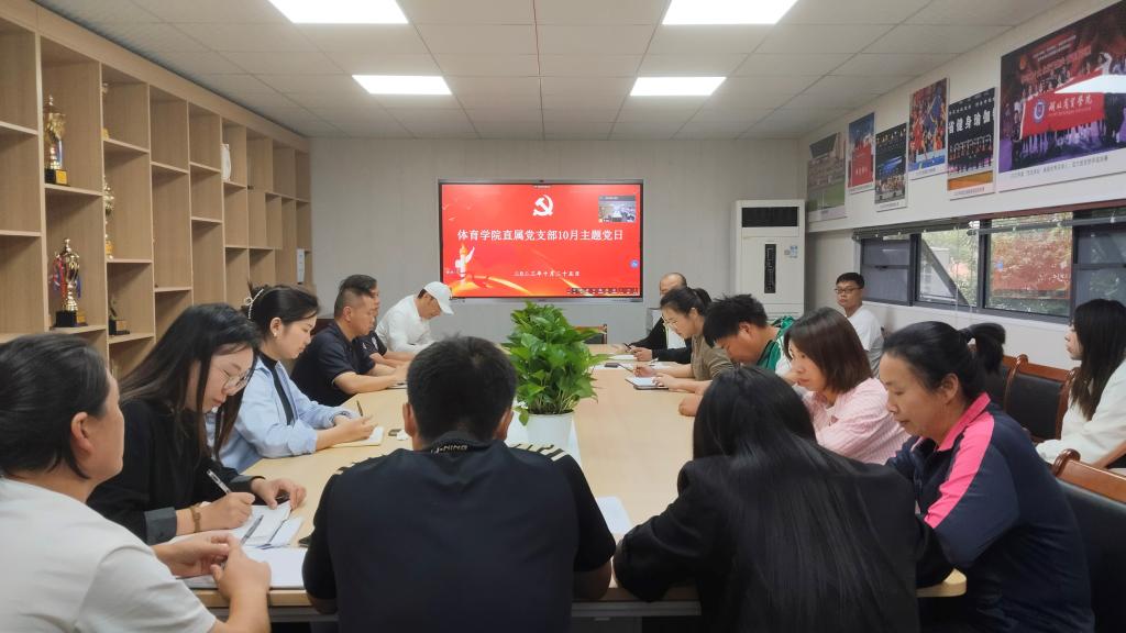 10月25日下午,体育学院直属党支部在学院会议室开展“深入学习宣传贯彻党的二十大精神,深入开展学习贯彻习近平新时代中国特色社会主义思想主题教育”支部主题党日活动,学院全体党员参加,活动由直属党支部书记何婷主持。