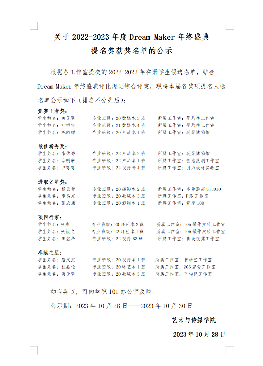 艺术与传媒学院Dream Maker年终盛典提名奖评审会的成功举办,无疑对激励学生积极进取、提升综合素质具有重要意义,体现了艺术与传媒学院在人才培养方面的高度重视。在未来,我们期待有更多的优秀学子能在Dream Maker的舞台上展现才华,为艺术与传媒学院争光添彩。