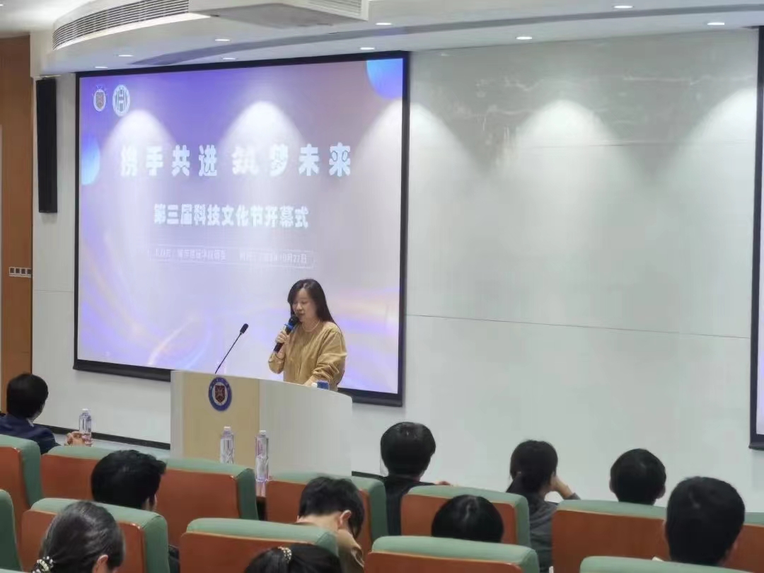 开幕式第一项:由张悦致开幕词,她首先代表城市建设学院对到场的领导和嘉宾们表示了热烈的欢迎,,她强调本次科技文化节在本科教育评估的背景下,坚持培育学生科技创新意识,旨在提升学生综合能力,在营造学院整体良好学术氛围的同时,全面推动校园科技文化建设。她期望同学们在本次活动中展现自己的才华和创造力,将理论知识与实践创新结合起来,在本次科技文化节的舞台上展示自我,追求卓越。