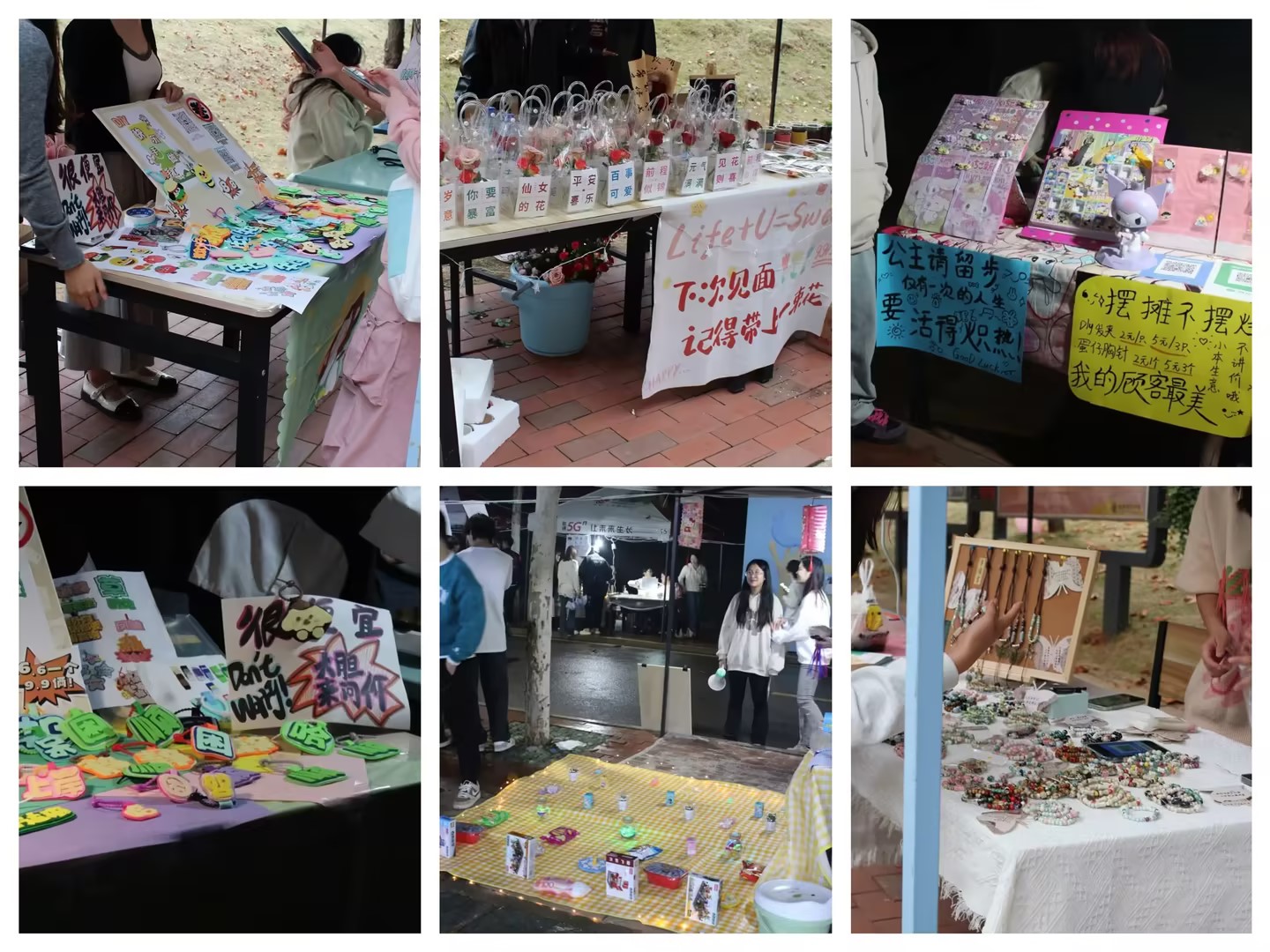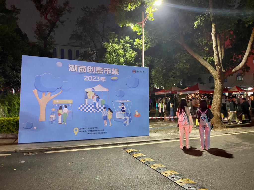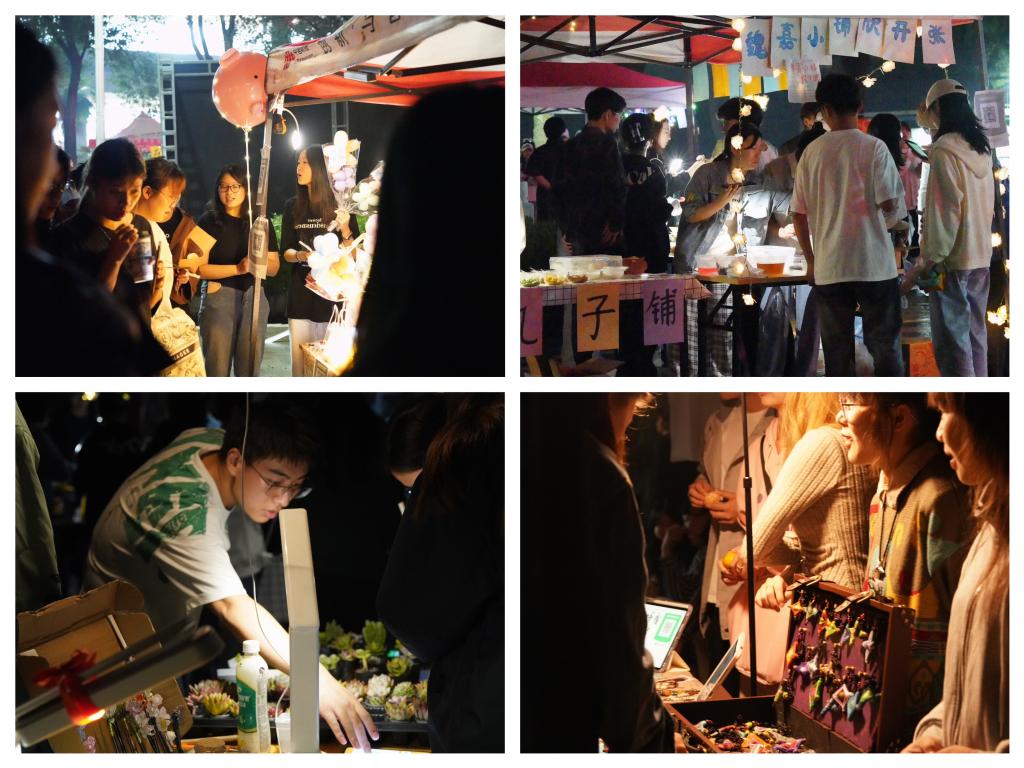 市集中,师生熙来攘往,来自各学院的“创客”青年们精心布置摊位,忙不停歇地热情招呼顾客,散发出别样的热闹气息。