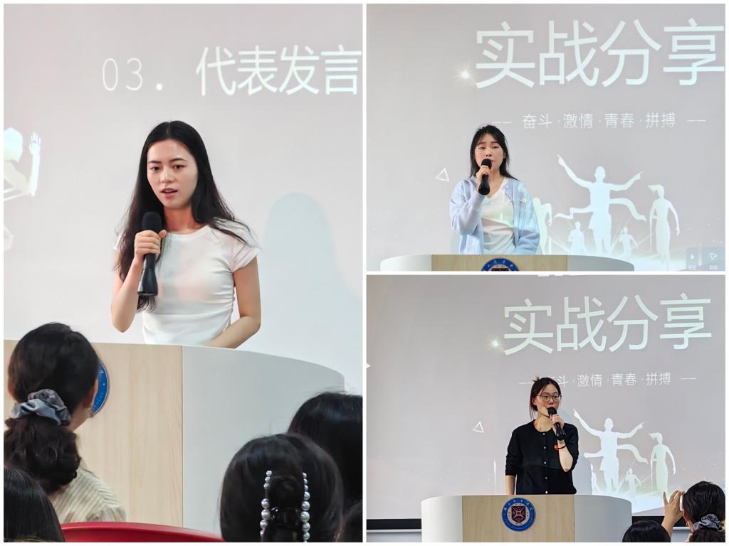 2021级参加四级考试并取得好成绩的学生代表们分享了她们的实战经验,从专四考试的各种题型解题方法到词汇、语法,备考技巧和考试心得等各个方面,结合自身的实际经验,分享了满满的干货,同学们受益匪浅,深受启发,增强了学习信心和动力。