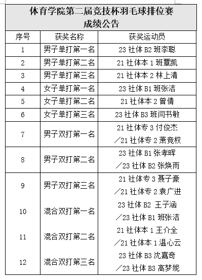 经过如火如荼的精彩角逐,在选手们拼搏的汗水中,本届“竞技杯”羽毛球排位赛最终分出了结果。23社体B2班李聪荣获男子单打冠军,21社体本1覃凯荣获男子单打亚军,21社体本2林上清荣获男子单打季军;23社体B1班张洁荣获女子单打冠军,21社体本2曾倩荣获女子单打亚军,23社体B3班闫书敏荣获女子单打季军;21社体专3付俊杰/21社体专2萧竞权荣获男子双打冠军,23社体B1张孝晖/23社体B2张焕雨荣获男子双打亚军,21社体专3聂子豪/21社体专2袁广进荣获男子双打季军;23社体B2王子涵/23社体B1班张洁荣获混合双打冠军,21社体本1王介全/21社体本1温心云荣获混合双打亚军,23社体B3沈嘉奇/23社体B3高梦妮荣获混合双打季军。