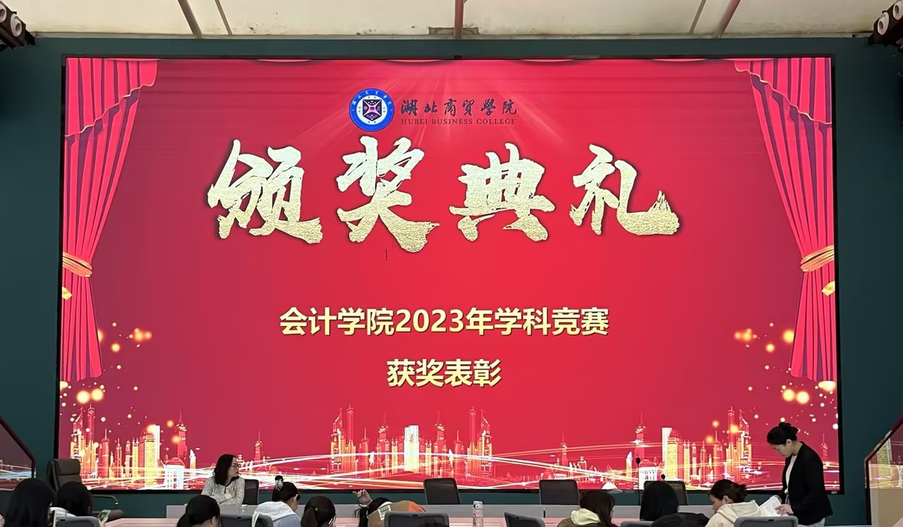 颁奖典礼伊始,主持人孙孟野代表学院向获奖师生表示热烈的欢迎和衷心的祝贺。随后宣布学院在“2023年全国高校商业精英挑战赛会计与商业管理案例竞赛”、“2023年全国证券投资模拟实训大赛”、“第六届企业价值创造实战”、“湖北省第十四届“挑战杯·中国银行”大学生课外学术科技作品竞赛”、“第十三届全国大学生电子商务“创新、创意及创业”挑战赛”、“2023年全国高等院校数智化企业经营沙盘大赛”、“第十二届全国校园财会大赛全国总决赛”七个赛事中获奖的师生名单,分别由吕碧君、肖虹霞、学院团委书记金益和李杰教授为获奖师生颁奖。