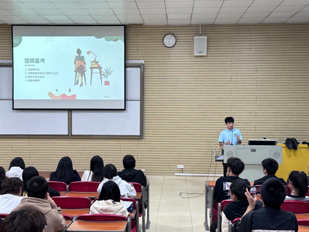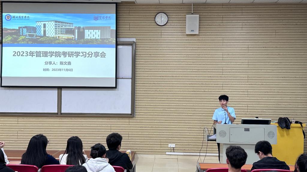 为进一步营造浓厚的学习氛围,提高学生考研积极性和学习成功“上岸”的经验技巧。管理学院于11月6日在咸宁校区教学楼A109教室成功举办了考研学习分享会,优秀毕业生陈文鑫同学作为主讲人,在会上分享他考研的经验、心得和备考技巧。