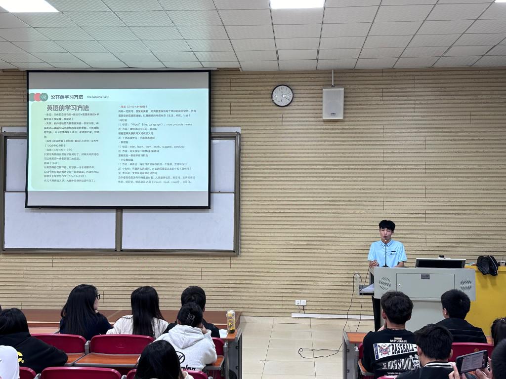 其次,陈文鑫同学分享了他的学习方法和策略。他表示,在备考过程中,需要制定科学的学习计划和策略,合理安排时间,掌握知识点,熟悉考试技巧,注重学习效率。在分享的最后,他送给大家了一句话“只有走完该走的路,方能走想走的路”。