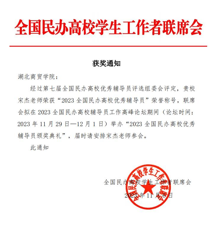 近日,第七届(2023)全国民办高校优秀辅导员评选结果揭晓,我校艺术与传媒学院分团委书记宋杰获评“2023全国民办高校优秀辅导员”荣誉称号。