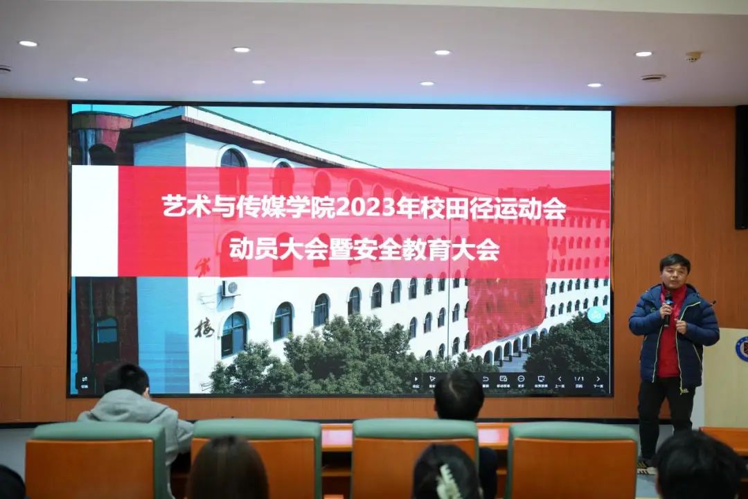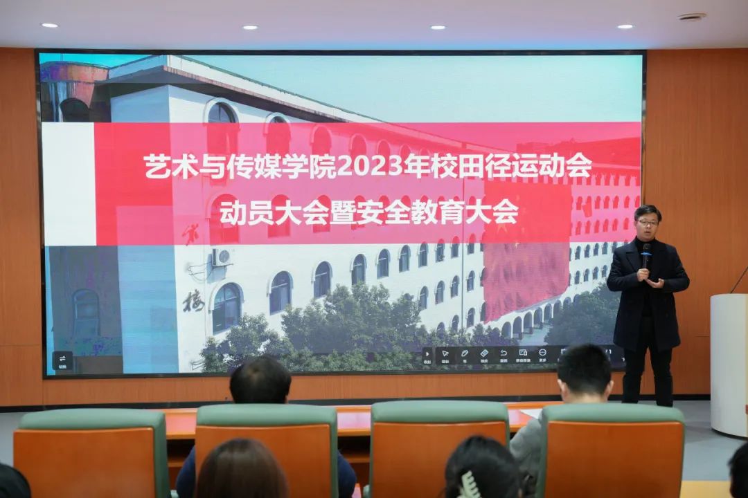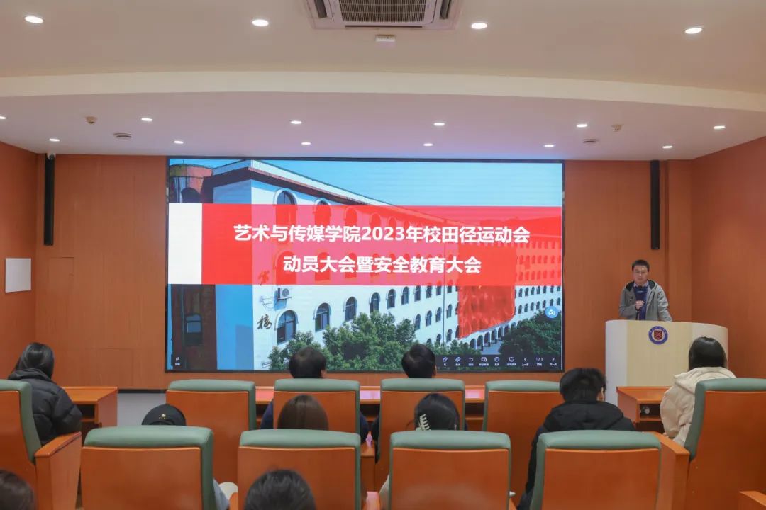 11月14日,艺术与传媒学院在图书馆一楼报告厅举办2023年校运会动员大会暨安全教育宣讲会。学院党总支书记毛宇、分团委书记宋杰、体育学院教师杨洋、全体辅导员、学生干部及全体运动员参与了本次大会。