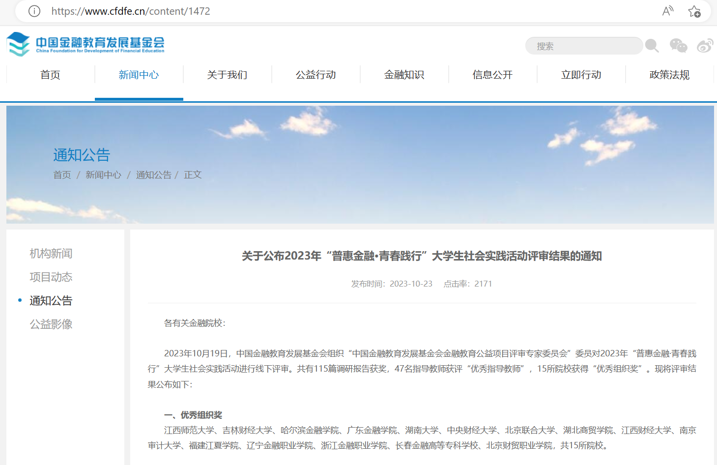 近日,中国金融教育发展基金会公示了2023年“普惠金融·青春践行”大学生暑期社会实践评审结果,我校与中央财经大学、吉林财经大学等15所财经院校获优秀组织奖。