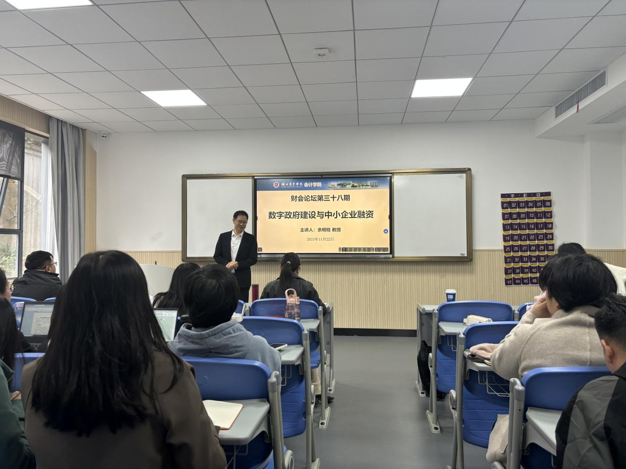 11月22日,会计学院特邀中南财经政法大学金融学院院长余明桂教授在鸿博楼2-103开展了主题为“数字政府建设与中小企业融资”的财会讲座。该讲座由会计学院副院长郑晓燕主持,会计学院教师参加了此次财会论坛。