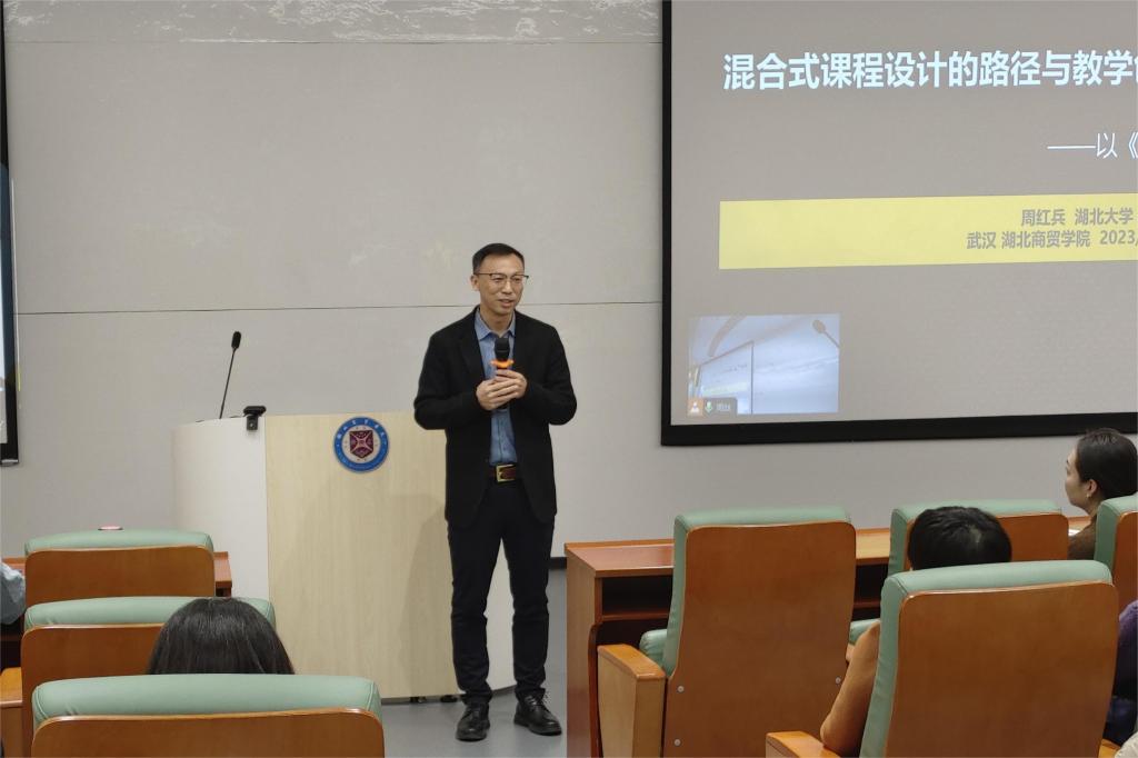 11月22日下午,外语外事学院邀请到湖北大学周红兵副教授在鸿博楼阶一为老师做题为《混合式课程设计的路径与教学创新手段提升的方法》的讲座。外语学院院长全体专职教师参加。讲座由院长王谷子主持。