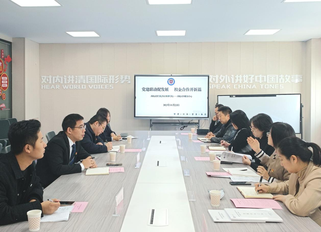 为加强基层党建工作交流,以党建合作共建,推动校企合作、实习实训工作进一步深化落实。11月23日,湖北省对外友好出国服务有限公司(以下简称“外服中心”)与外语外事学院就校企合作、基层党建等开展联学联建活动。
