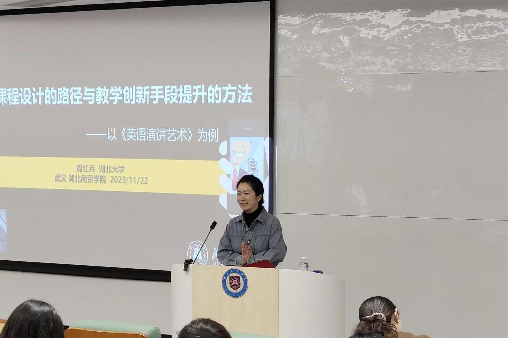 11月22日下午,外国语学院邀请到湖北大学周红兵副教授在鸿博楼阶一为老师作题为《混合式课程设计的路径与教学创新手段提升的方法》讲座。学院全体教师参加。讲座由院长王谷子主持。