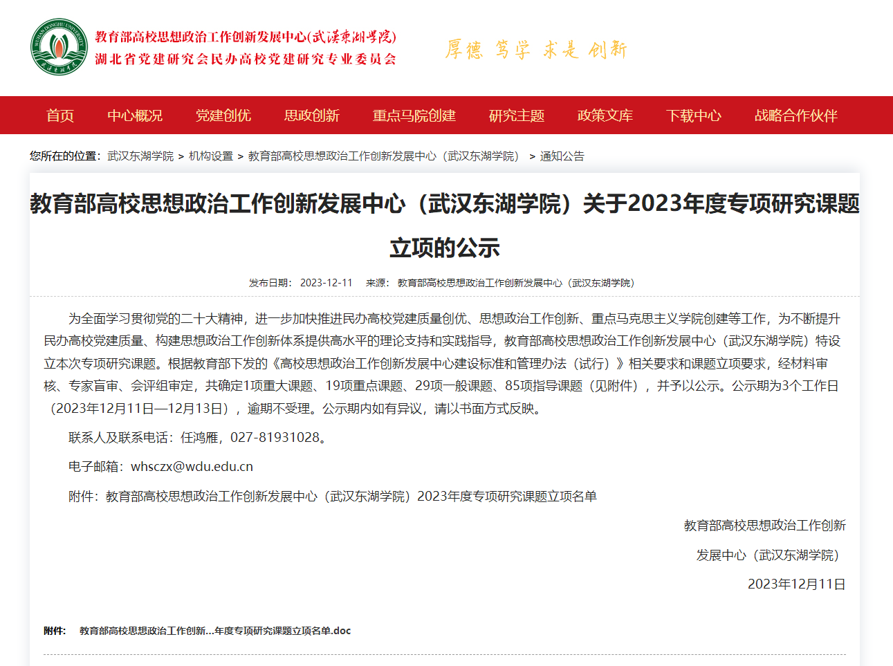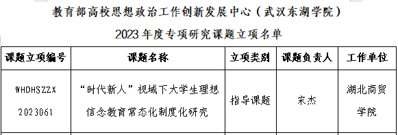 近日,教育部高校思政创新发展中心(武汉东湖学院)公布了《关于2023年度专项研究课题立项的公示》,我校艺术与传媒学院分团委书记宋杰老师主持申报的课题《“时代新人”视域下大学生理想信念教育常态化制度化研究》成功立项。