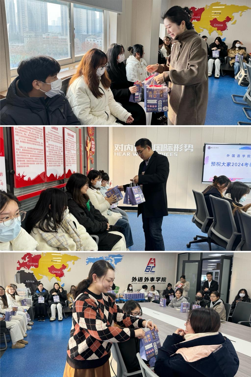12月20日,一场特殊的祝福活动在外国语学院举行。为了给即将参加研究生入学考试的学子们加油打气,我校外国语学精心策划了一场送祝福活动,为即将参加研究生入学考试的24届学子们送上了一份特别的祝福大礼包。