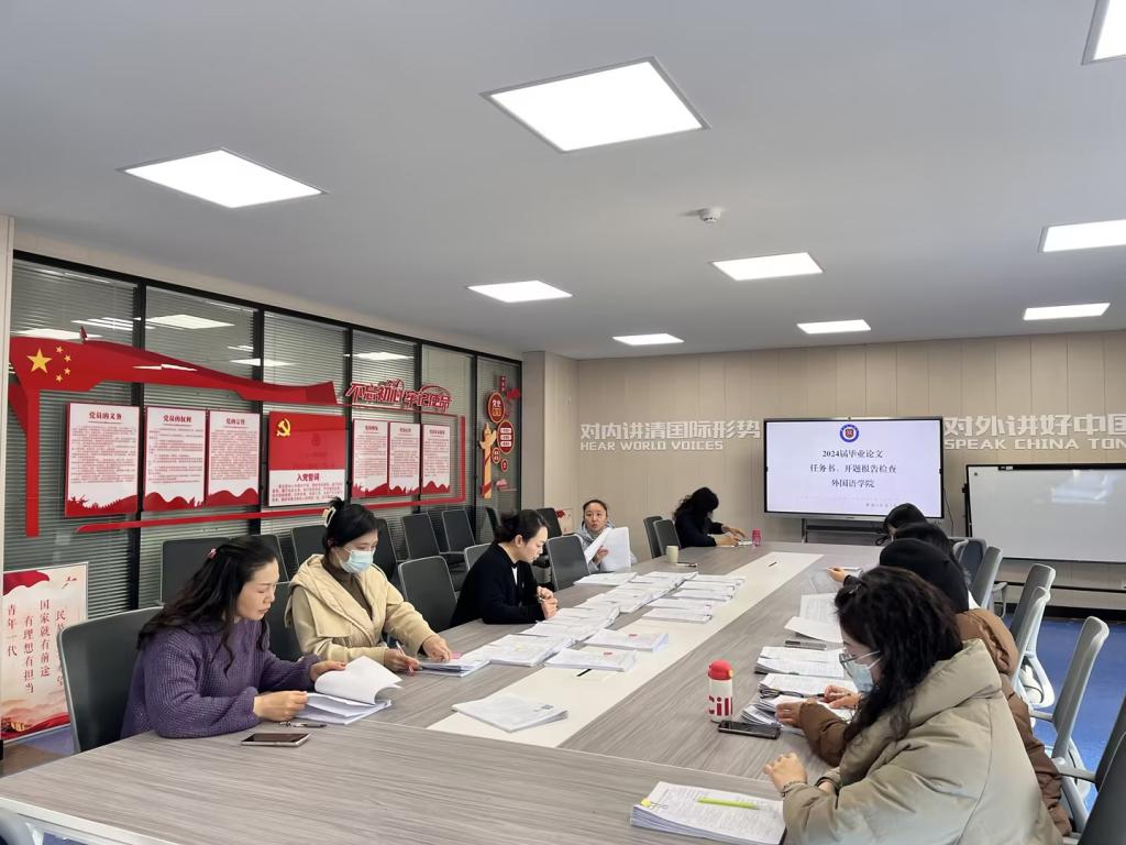 根据教务处、教学质量管理处工作安排,12月25日下午,外国语学院在教师自查、教研室互查的基础上,对2024届毕业论文任务书及开题报告进行集中检查。学院论文领导工作小组及二级督导参与检查工作。