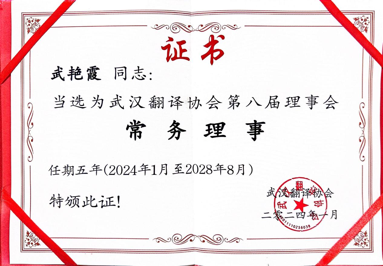 1月27日,武汉翻译协会召开第八届理事会常务理事会议。会长马萧教授宣读首批常务理事名单。外国语学院副院长武艳霞当选为第八届理事会常务理事。