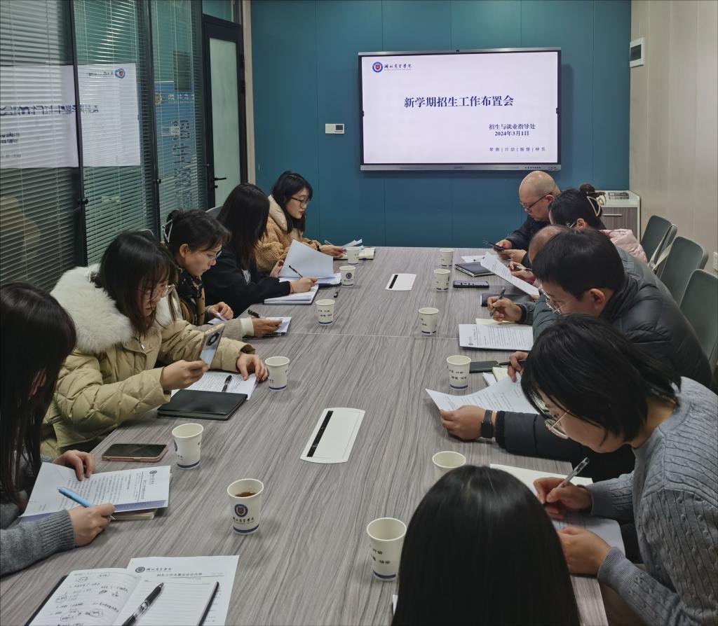 为全面提升我校招生工作质量与效率,3月1日,招生与就业指导处在行政楼2楼会议室召开2024年新学期招生工作布置会。招生与就业指导处相关工作人员、各学院招生联络员参加会议。会议由招生与就业指导处副处长张怡丹主持。