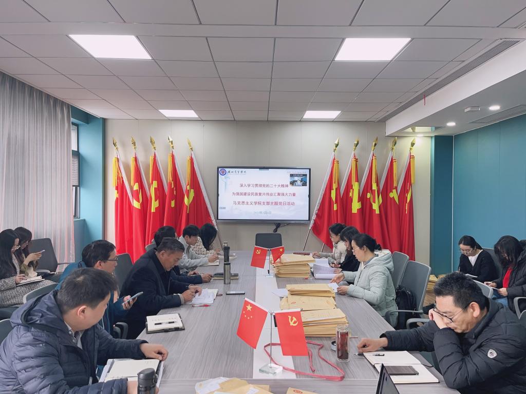 3月6日,马克思主义学院党支部在学院会议室成功举办了主题为“深入学习贯彻党的二十大精神,为强国建设民族复兴伟业汇聚强大力量”的党日活动。本次活动由副院长金敏主持,马克思主义学院院长、党支部书记孔波出席并发表了重要讲话。学院党支部全体党员、部分师生代表参加了此次活动。