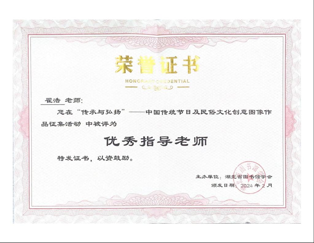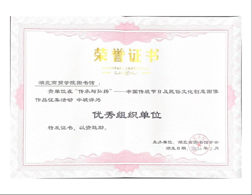 近日,由湖北省图书馆学会联合广州冠岳网络科技有限公司,举办的“传承与弘扬”为主题的中国传统节日及民俗文化创意图像作品征集活动公布了获奖结果。我校图书馆获评“优秀组织单位”,经济学院翟浩老师获评“优秀指导老师”,经济与管理学院刘若茜等五位同学的参赛作品也分别获奖。