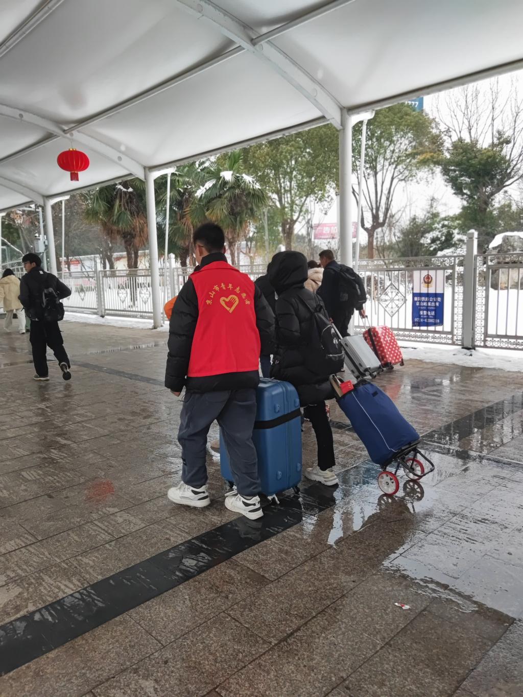 最后,肖瑶和其他志愿者们积极协助旅客搬运行李,确保他们能够轻松、愉快地踏上回家的路。雪虽然冷,但铲雪人的情意却温暖如春。