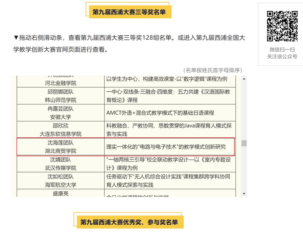 近日,第九届西浦全国大学教学创新大赛结果揭晓,我校人工智能学院沈海莲团队首次参赛就荣获年度教学创新三等奖。本届大赛于2023年5月21日拉开帷幕,共吸引266所院校的1309组,共3898名高校教师及团队的参与,历经资料初审、大众评审、专家函评等赛程。参加此次大赛的沈海莲团队(成员包括沈海莲、代敏2位老师)的参赛课程是《理实一体化的"电路与电子技术"的教学模式创新研究》,他们坚持 “以学生为中心”,从确定学习成果,重构教学内容、教学实践设计方面,构建理实一体化的课程教学创新与实践,致力于解决当前教学中存在的教与学的问题。该教学模式激发了学生的学习兴趣和对知识的探索研究兴趣,实现由被动学习向主动学习的转换。