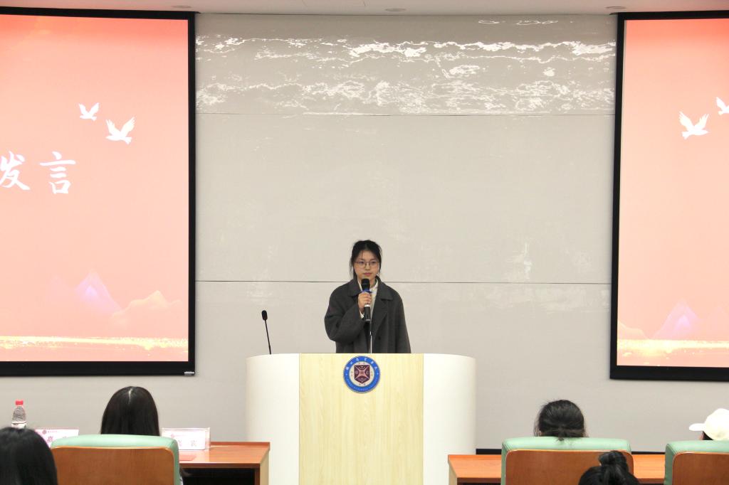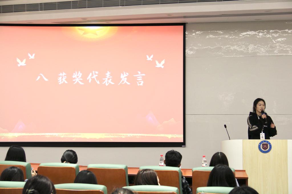 获奖代表蔡思琴上台发言。她首先感谢了老师和团委学生会的同学。分享了自己如何调节工作与学业的关系,表示在思想上时刻要求进步,积极向党组织靠拢。最后衷心祝愿大家身体健康,工作顺利,学业有成。
