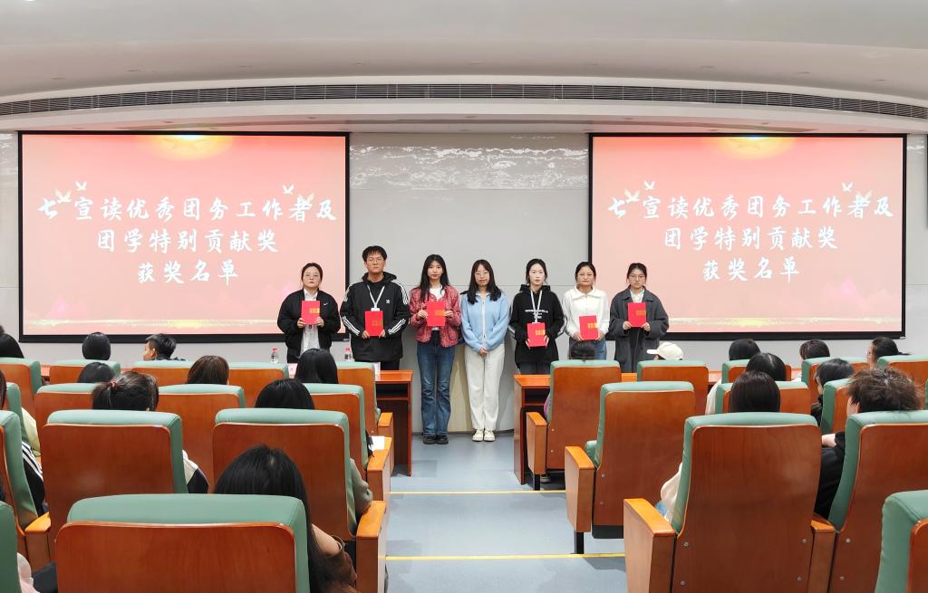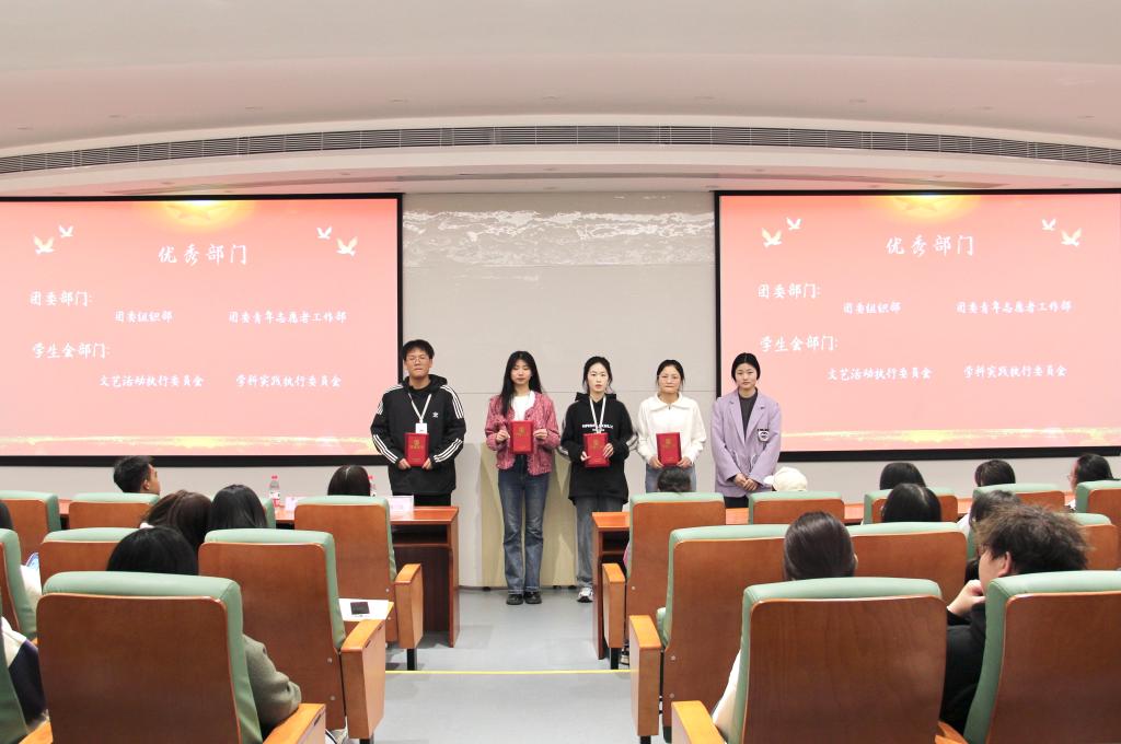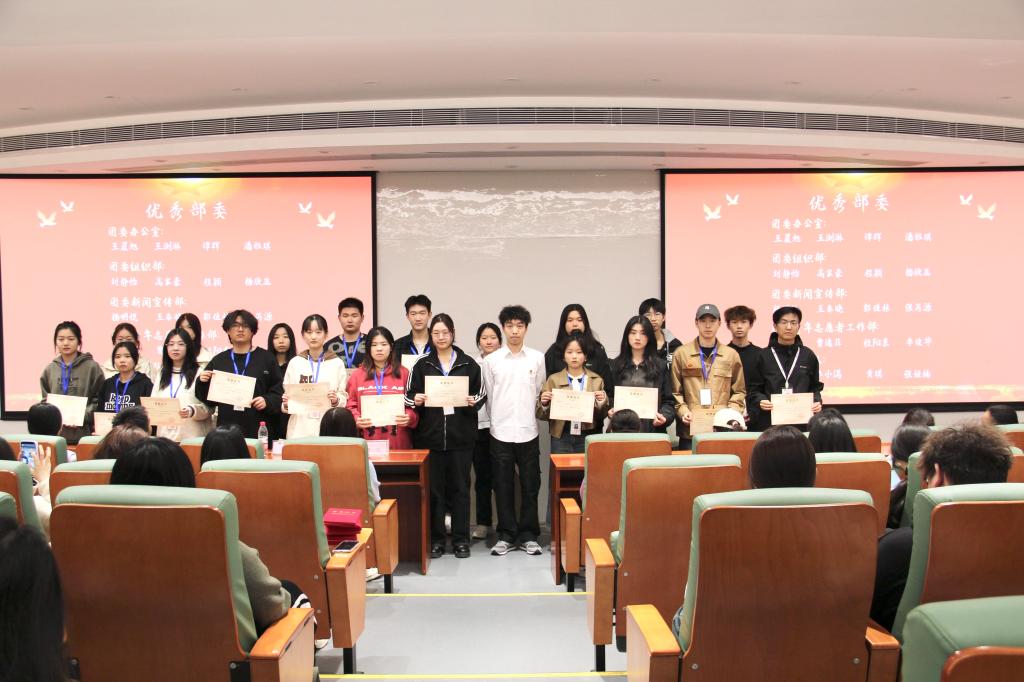 学院团委书记金益宣读2023-2024学年第一学期优秀团务工作者和团学特别贡献奖获奖名单。他们是团委、学生会的中流砥柱,感谢他们的付出,为学院工作贡献了力量。希望其他学生干部可以保持认真谦虚谨慎态度向他们学习,通过榜样的力量提升自己,成为更优秀的人。