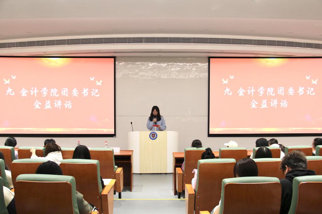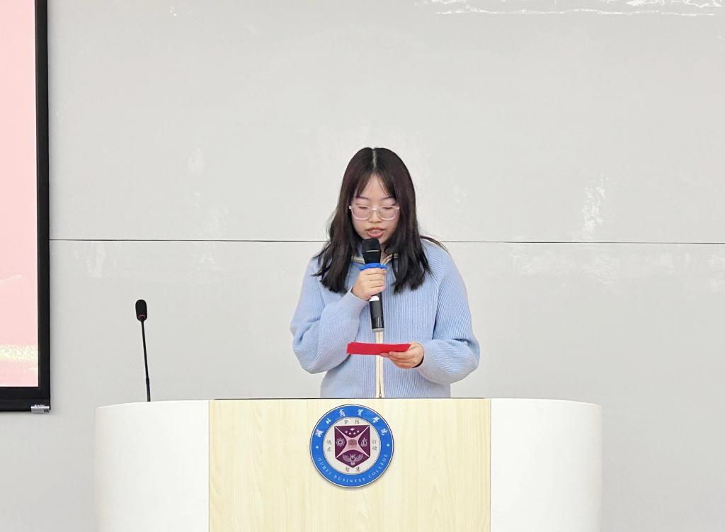获奖代表林宇君上台发言。她给大家分享了经验和教训。首先就是要爱自己,其次是要试错,年轻就是资本,要趁年轻就走出自己的舒适圈,去挑战自己。最后希望大家在会计学院的大家庭里面能够有所收获,并且希望会计学院这个大家庭越来越好。