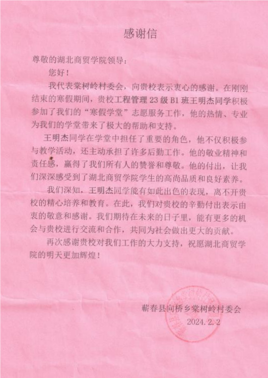 信中提到,在2024寒假,王明杰同学积极参加村委会组织的“假期学堂”志愿服务工作,在工作中他的热情、专业为“假期学堂”志愿服务工作带来极大帮助与支持;在“假期学堂”志愿服务工作中,王明杰同学不仅承担教学活动,还主动承担了许多后勤工作,他的敬业精神和责任感,赢利了所有人的赞誉和肯定,他的付出,让家乡人深深感受到湖北商贸学院学生的高尚品质和良好素养。感谢信是对我校学子在基层实践中奉献智慧与力量的肯定,也是对他们挥洒汗水、激扬青春、彰显责任与担当的见证。