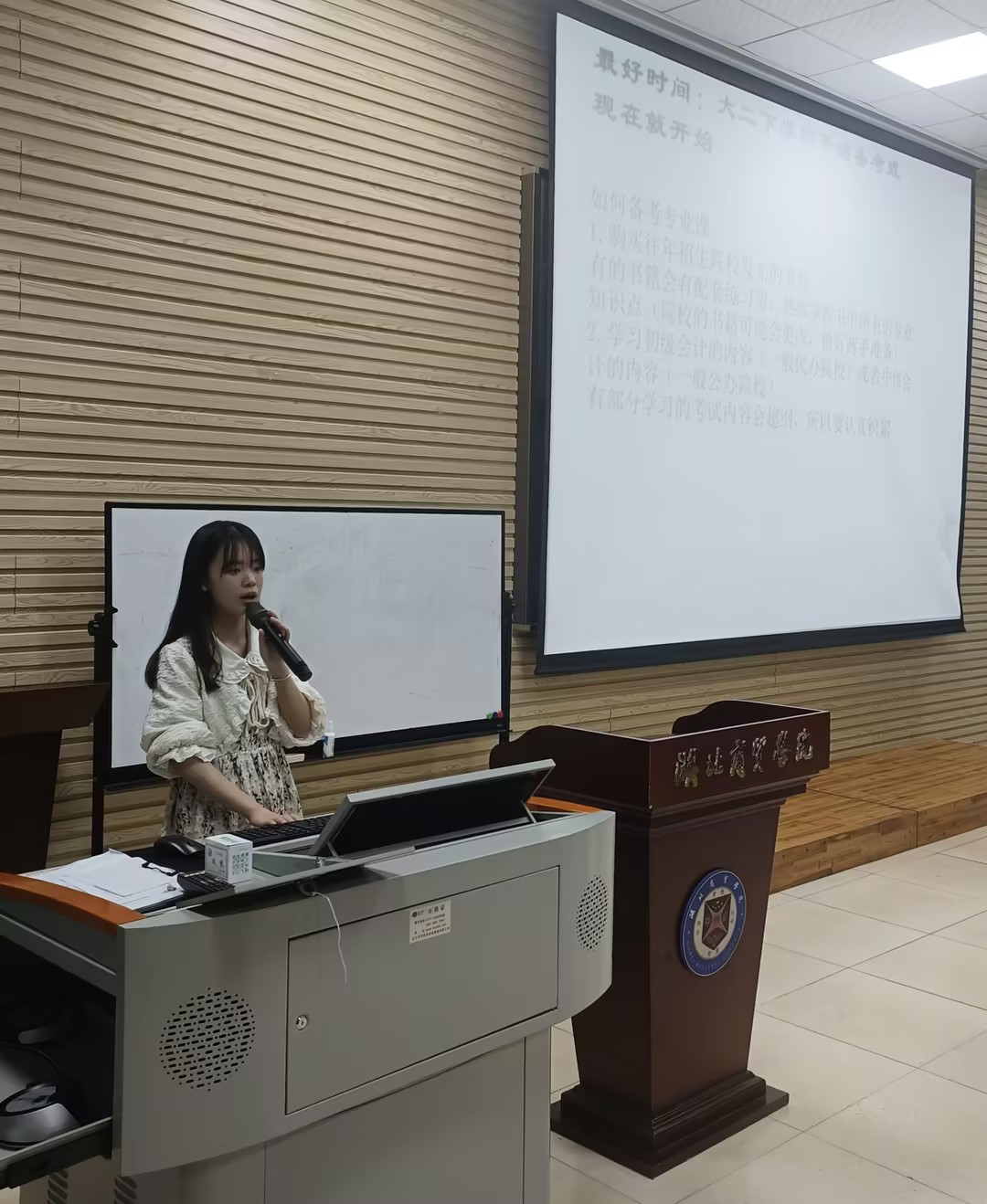曹梦洁同学毕业于武汉船舶职业技术学院,通过专升本考试并以总分165的高分录取于湖北商贸学院会计学专业。对于什么是专升本考试,曹梦洁同学分别介绍了统招、自考、成考的三种考试类型,并着重介绍统招专升本相关政策信息。让参会同学充分了解专升本报考途径及信息搜索网站路径;依次介绍了报考条件限定、招生院校选择、报名时间以及报名流程,解决同学们报考无从入手的困惑、迷茫,明确专升本报考前期准备工作。