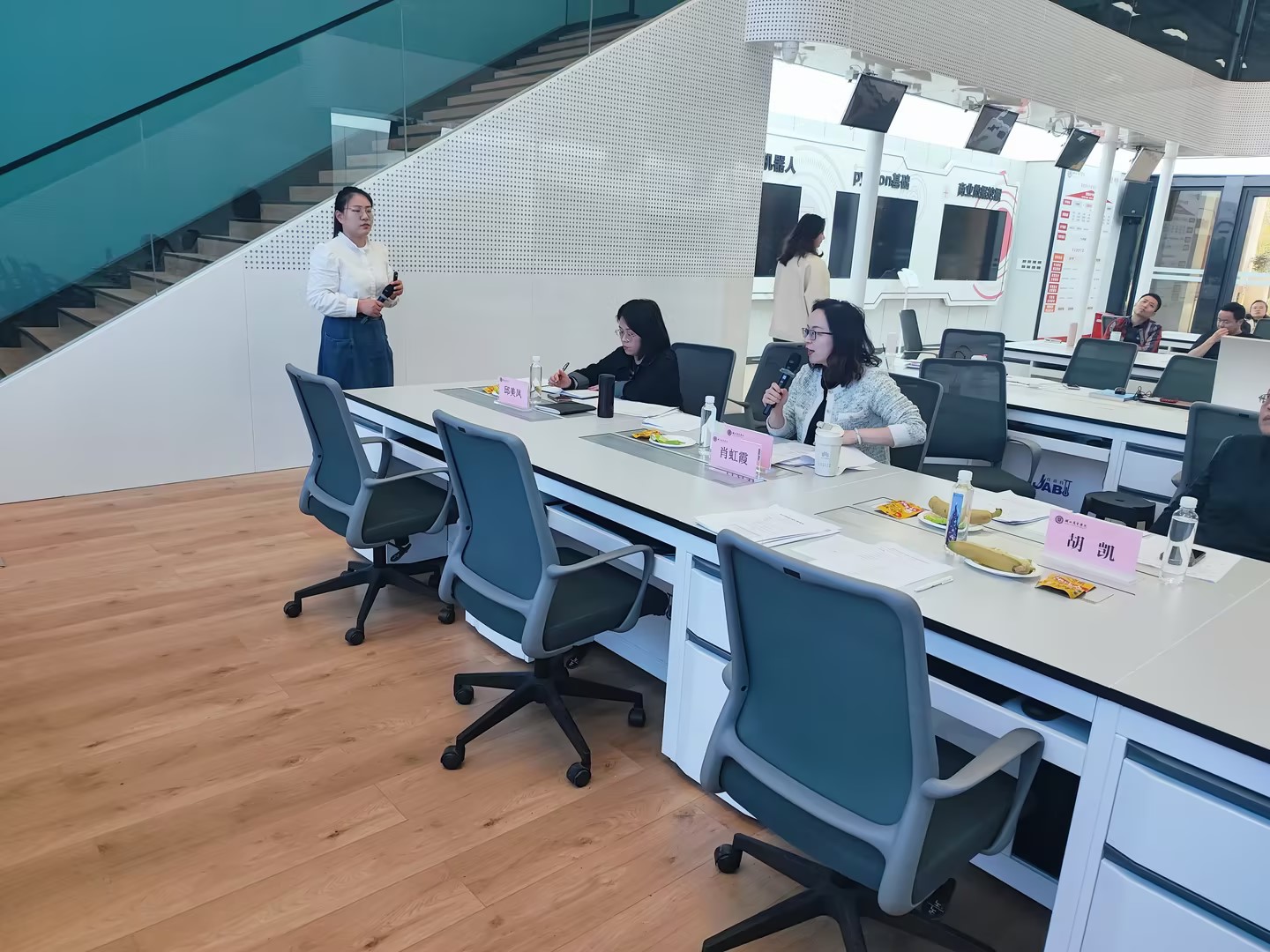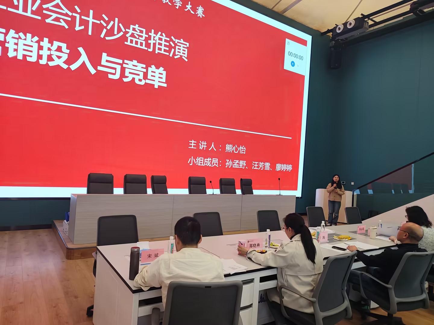 大赛于下午开始,吕碧君致开场辞,主持人陆静婕介绍了竞赛评委、流程和评分规则。接下来五个小组进行现场展示,并由评委进行专业点评。最后由肖虹霞进行大赛总结,公布最终成绩并颁奖以及合影留念。