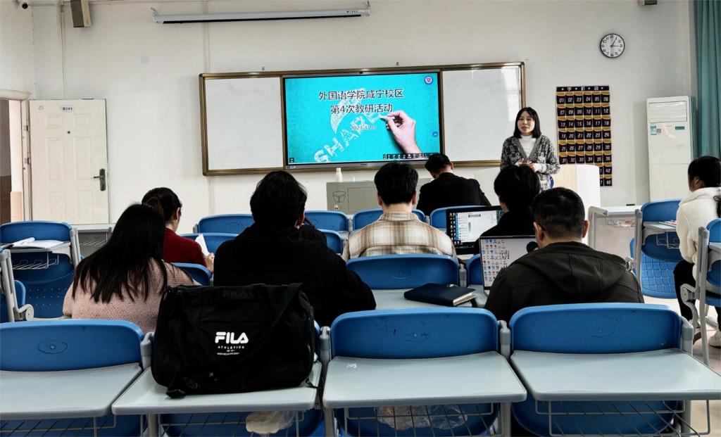 4月10日,外国语学院(咸宁校区)举办本学期第四次教研活动。本次教研以“课外教学视频资源分享”为主题,副院长邵建芳、教研室主任黄佳卉及全体教师参加了本次活动。其中,三位优秀教师就该主题进行了经验和视频资源分享。