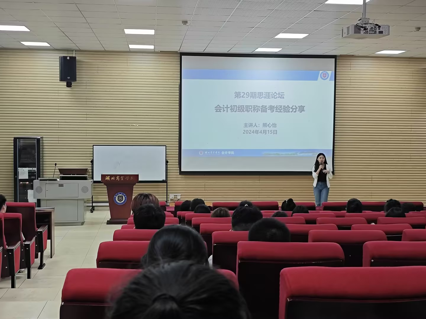 距2024年会计初级职称考试还有一月左右时间,为帮助会计专业学生科学备考,4月15日,会计学院在咸宁校区A108教室举办第二十九期思涯论坛——“会计初级职称备考经验分享”。本次讲座由会计学院熊心怡老师主讲。