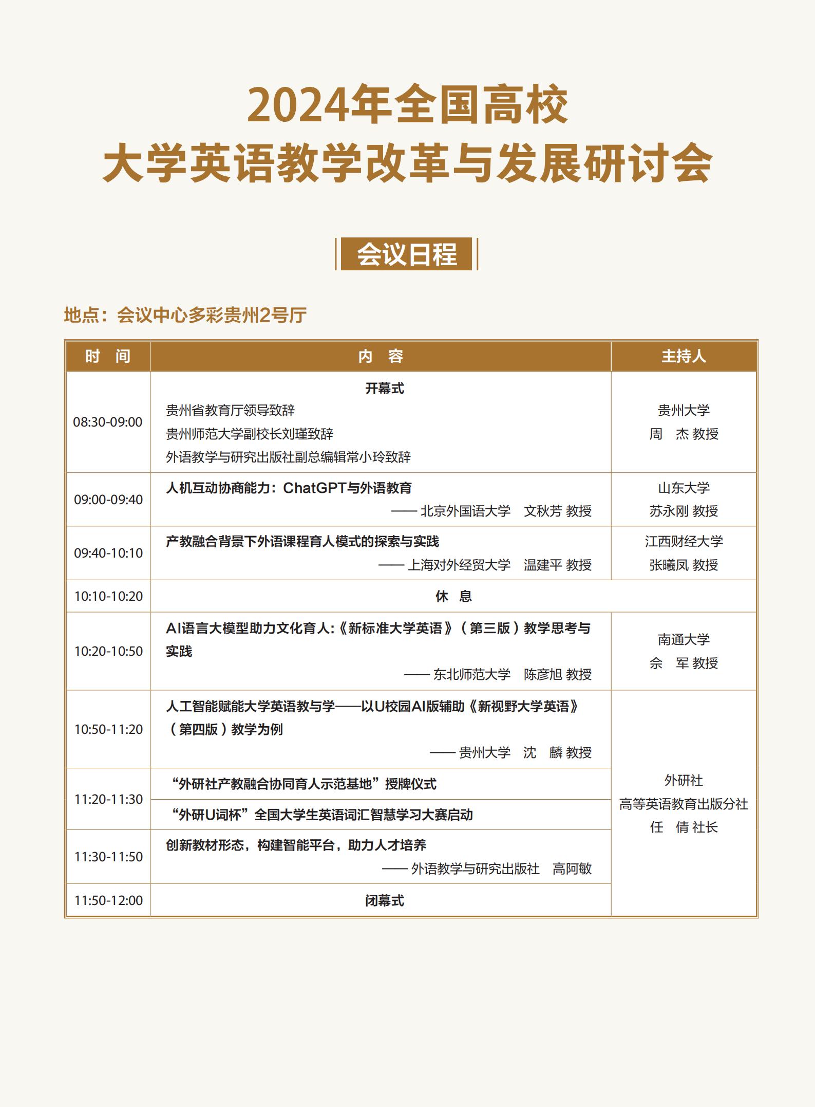 在此次会议中,北京外国语大学文秋芳教授、上海对外经贸大学温建平教授、东北师范大学陈彦旭教授、贵州大学沈麟教授分别发表了主旨报告。他们围绕“人机互动协商能力:ChatGPT与外语教育”、“产教融合背景下外语课程育人模式的探索与实践”、“AI语言大模型助力文化育人:《新标准大学英语》(第三版)教学思考与实践”以及“人工智能赋能大学英语教与学——以U校园AI版辅助《新视野大学英语》(第四版)教学为例”等主题进行了深入探讨。