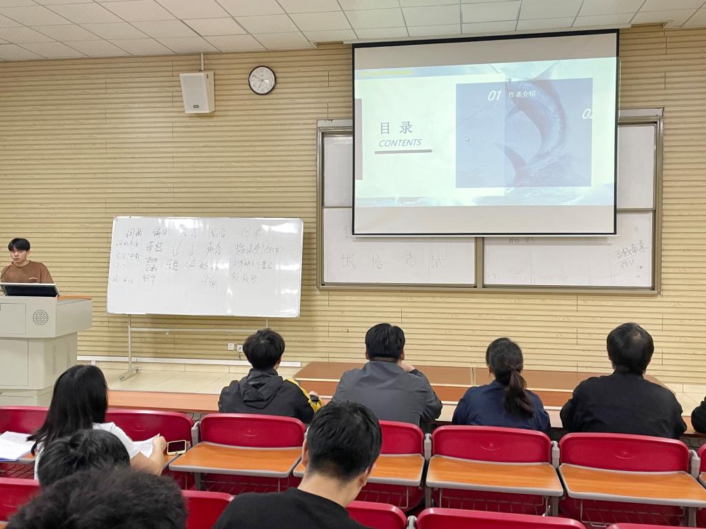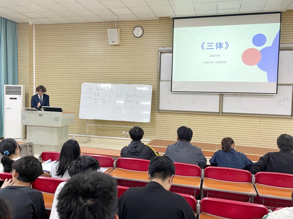 孙董乔喆同学给大家分享的是刘慈欣老师的《三体》。作品讲述了地球人类文明和三体文明的信息交流、生死搏杀及两个文明在宇宙中的兴衰历程。《三体》的文本叙事在“后人类”的思考上有着重大突破,构建了科学与文学的互动范式,将道德内涵引入对科技的辩证思考中。孙董乔喆以其独特的幽默演讲形式,让同学们进一步了解了这本书,并产生浓厚的阅读兴趣。
