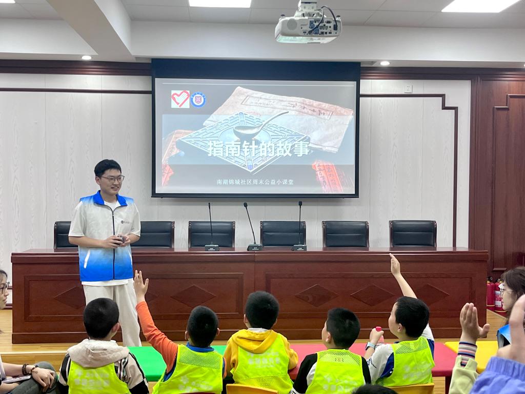 铭心志愿队队员兰江灵主讲第一节课,他引领小朋友们穿越历史的长河,探寻指南针的演变历程。从简单的磁石到现代精密的导航仪器,他细致入微地描述了指南针的构造,并展示了实物材料,让小朋友们亲手触摸这一古老而神奇的发明。而后,面对小朋友们的积极提问,他耐心的一一解答。在这一实践过程中,不仅加深了小朋友们对指南针的印象,更让他们在探索中感受到了科学的魅力。