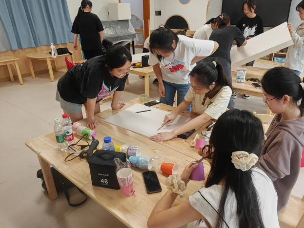 接着,学生们分小组与幼儿园一线教师共同围绕“长江特色文化”开展主题环境创设和制作,深化对中华优秀传统文化的认知与理解,提高动手能力、创新能力和团队合作能力。制作完成后,课程负责人和幼儿园一线教师共同反馈学生在环创实践中的优缺点。