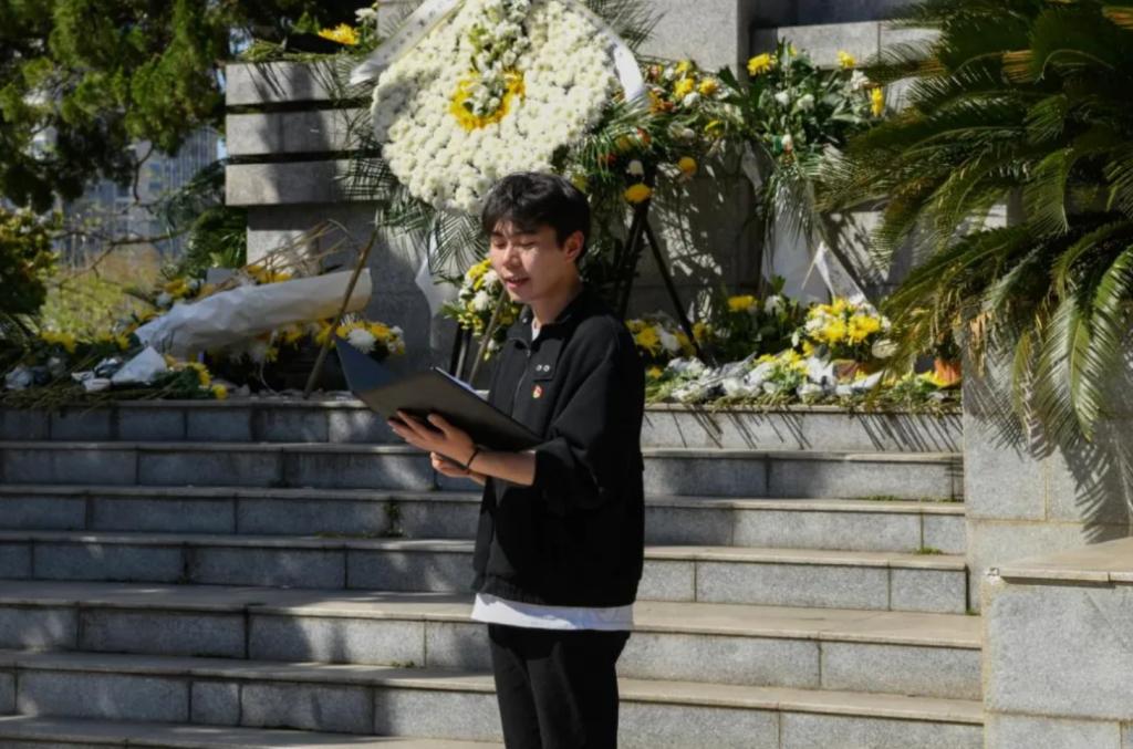 在烈士碑前,优秀学生党员代表余橙分享了革命先烈施洋的英勇事迹,并号召同学们“新时代的中国共产党人置身于中华民族伟大复兴战略全局和世界百年未有之大变局,我们要继承和发扬老一辈革命家不怕牺牲英勇斗争的精神,把红色江山世世代代传下去”。