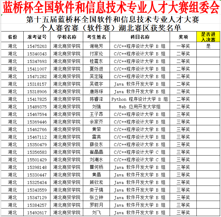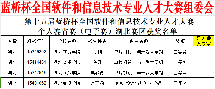 4月29日,工业和信息化部人才交流中心公布了第十五届蓝桥杯大赛个人赛省赛(软件类)和个人赛省赛(电子类)在湖北赛区的获奖名单。我校计算机科学与技术学院共27名同学在本次比赛中获奖,其中一等奖1人、二等奖10人、三等奖16人。获得一等奖的21计科本3班的谢艳芳同学将晋级参加全国总决赛,代表湖北商贸学院参加第十五届“蓝桥杯”全国总决赛。以下是获奖学生具体名单: