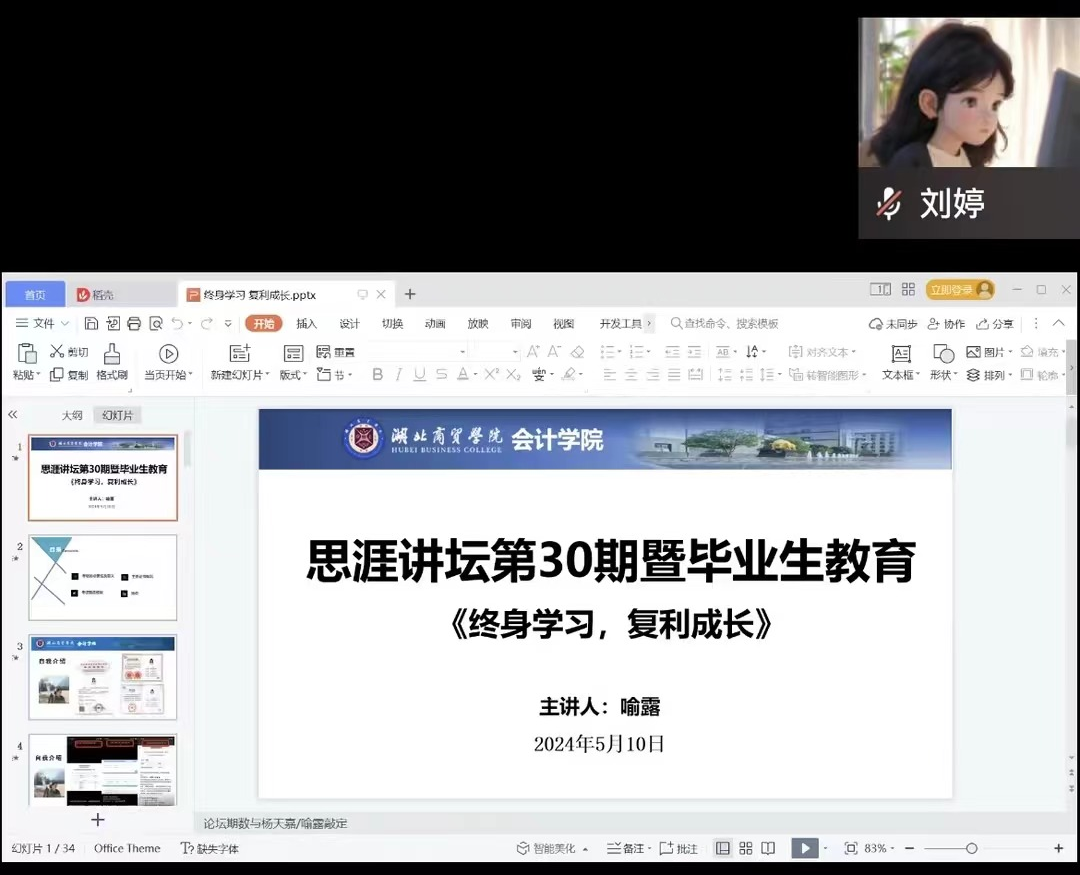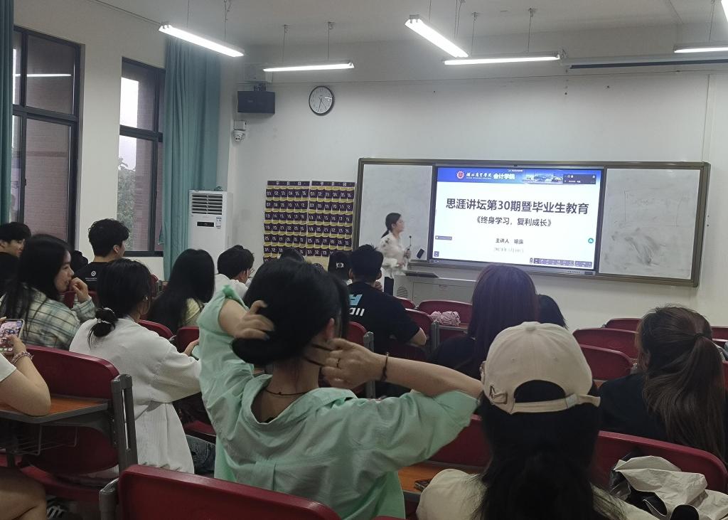 为帮助毕业生们更好地规划自己未来的职业发展、提升专业素养,会计学院于5月10日在咸宁校区举办第三十期思涯讲坛暨毕业生教育,讲座主题为“终身学习,复利成长”。本次讲座的主讲老师是会计学院喻露老师,23级会计及财管专升本学生线下参加了此次讲座,21届专科毕业生通过腾讯会议线上参与。