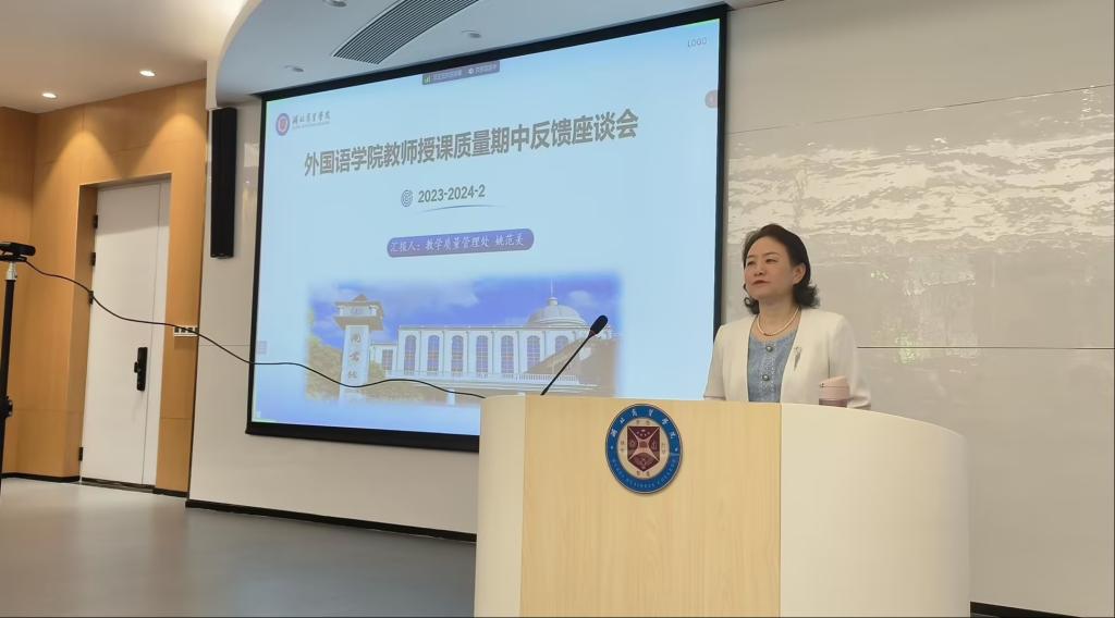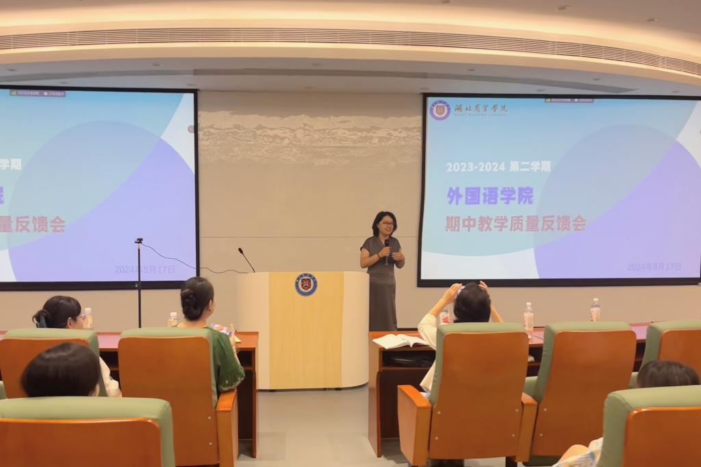 为进一步提升教学质量,提高教师队伍水平,外国语学院于5月17日下午在鸿博楼J1教室举行了23-24-2学期期中教学质量反馈会。本次反馈会由教学质量管理处牵头,外国语学院具体组织落实。教学质量管理处处长姚晓菊、督导姚范美教授受邀作反馈报告,外国语学院教师王冯骏子、周丝作为代表分享教学经验,其余教师参与本次反馈会,会议由外国语学院副院长武艳霞主持。