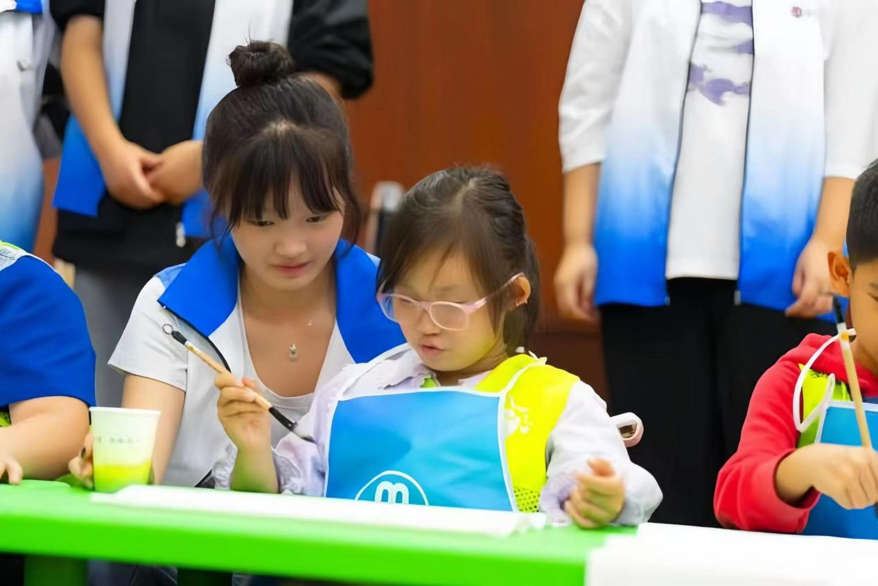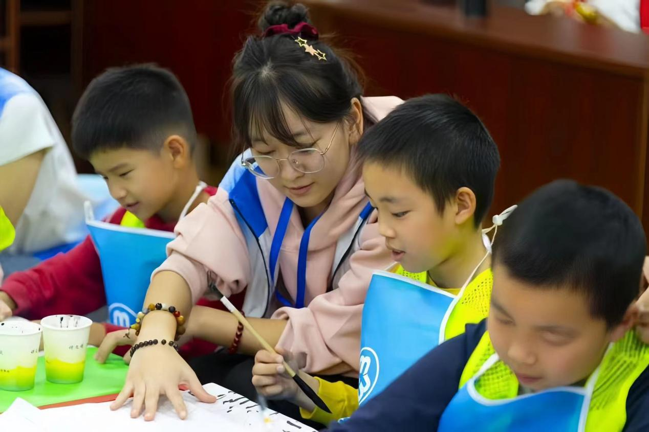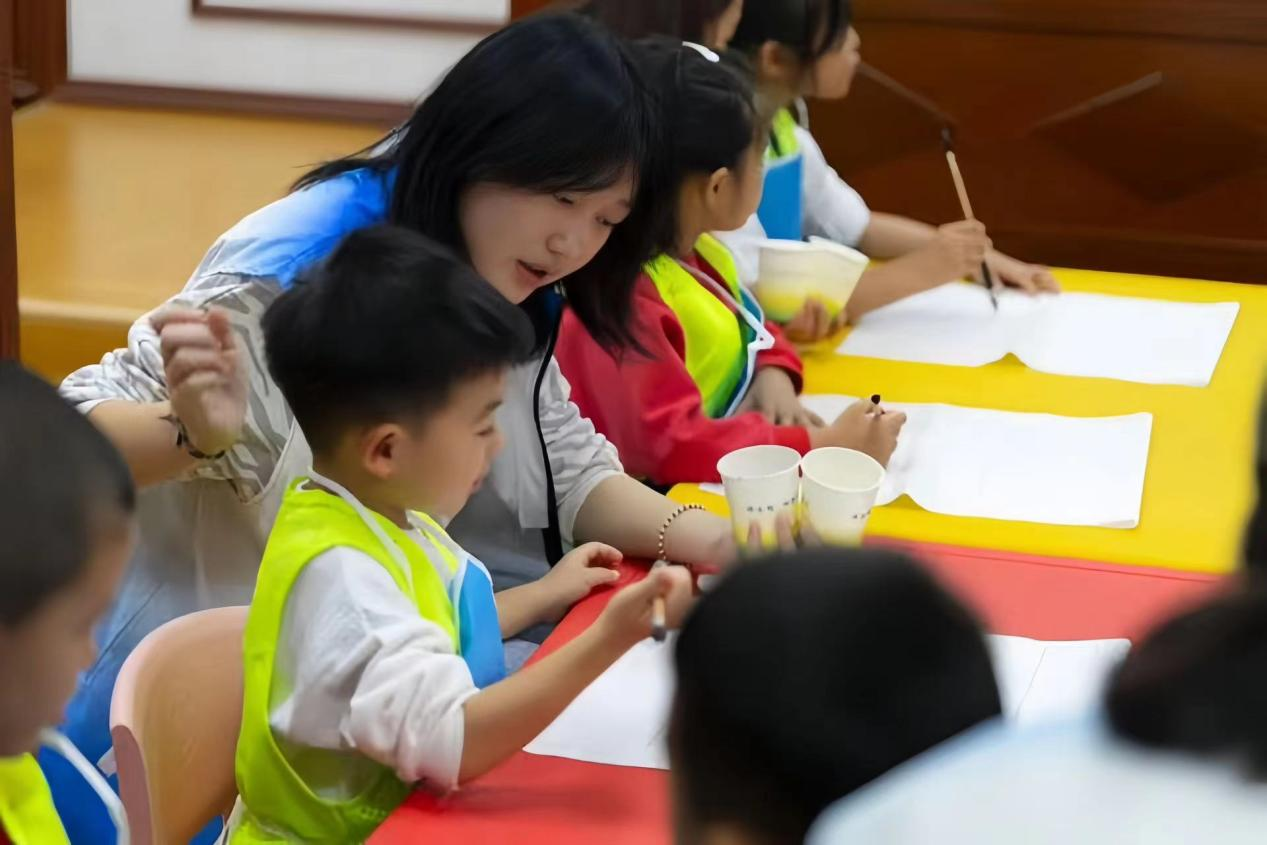 第三节课“穿越千年的画笔”,由七彩青年宣讲团队员尹佳丽主讲,她为小朋友们带来一堂了生动的书法课。她从练习书法时的“三平”坐姿和执笔时的“捏、钩、抵”教起,通过学习毛笔握笔和运笔,带领小朋友们用毛笔和墨水在白色宣纸上进行书法体验,体会汉字书画同源的妙趣。小朋友们在亲身体验中不仅领略到中国绘画的魅力,还培养了耐心和动手能力。