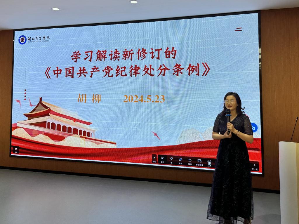 胡柳从《中国共产党纪律处分条例》修订的主要内容、鲜明特征、重要意义及如何贯彻执行等方面进行了详细解读。党的十八大以来,党中央三次修订《条例》,体现了严的基调,不断完善纪律规矩,彰显了我们党推进自我革命的坚定决心和坚强意志。她强调,师生党员要以实际行动坚定拥护“两个确立”、坚决做到“两个维护”,持续在学纪、知纪、明纪、守纪上发力,确保言行一致、令行禁止。