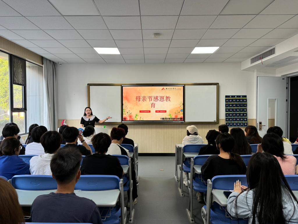 班会上,辅导员播放亲情类主题短片、分享经典诗文,向同学们讲述母亲节的由来与意义,并强调“感恩不仅是情感的表达,更是一种责任与品格的体现”。辅导员结合当代大学生成长实际,呼吁同学们“以行动回馈母爱”,从日常的关心问候做起,让感恩之心融入生活细节。