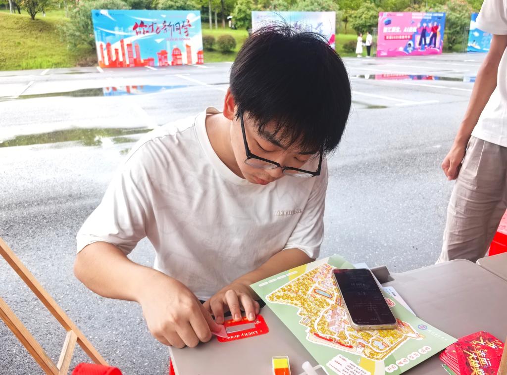 同时,学院筹备的数百份礼物通过“刮刮乐”发放,涵盖刷题笔、定制钥匙扣、小风扇等学习与生活好物,新生在刮开卡片的期待中收获惊喜,现场满是欢声笑语。