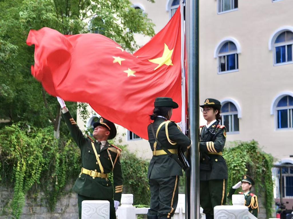 七时整,国旗护卫队迈着铿锵有力的步伐,护旗入场。伴随着庄严的《中华人民共和国国歌》,五星红旗冉冉升起,迎风飘扬,全体师生行注目礼,向国旗致敬。