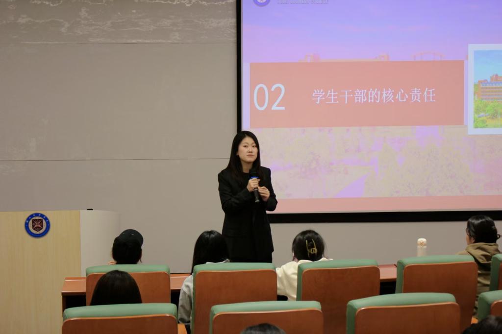王珉强调了学生干部在学院发展、学风建设及服务同学中的关键作用。她指出,学生干部首先是学生,其次是干部,核心目标是成长成才。本次培训旨在为各位学生骨干“赋能”,帮助大家明确职责、提升境界、掌握方法,将个人成长融入学院和学校发展的大局之中,实现自我价值与服务奉献的统一。她鼓励学生干部要珍惜岗位平台,将之视为锻炼能力、提升素养的宝贵机会。