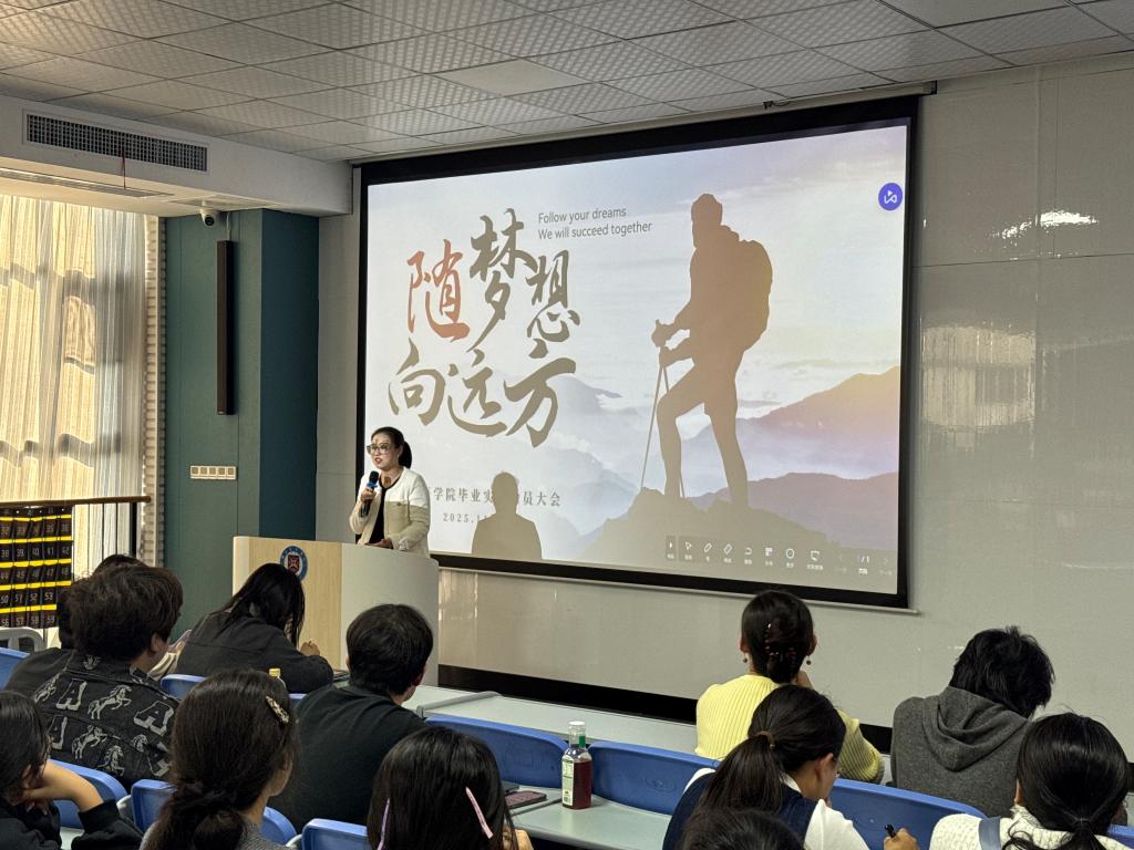 11月5日下午,外国语学院2026届毕业实习动员大会在鸿博楼J3召开。院长王谷子、党总支书记何婷、全体毕业班辅导员及实习指导老师参会,大会由就业专员张薇主持,2026届全体毕业生到场参会。