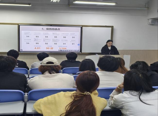 金雨菲凭借4.01的绩点、90分的平均成绩,连续两年在专业排名中位居榜首,现已获得4所国外大学的录取通知。她以“我们不是NPC,我们是人生主角”作为开场,结合自身经历,运用生动的案例和实用的方法,为学子们带来了一场既有深度又具价值的经验分享。