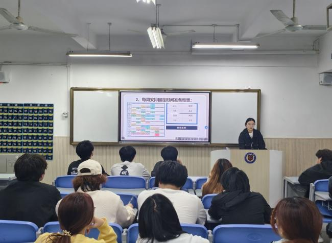 在分享过程中,她提出了自我认知的三个问题,助力学子确立目标,还展示了英语学习课表:“周一、周三、周五清晨听新闻,周二、周四、周六攻克雅思,周末进行模拟考试并复盘”。电子白板上呈现的详细规划,让在场学子清晰地掌握了时间管理技巧,纷纷提笔记录。